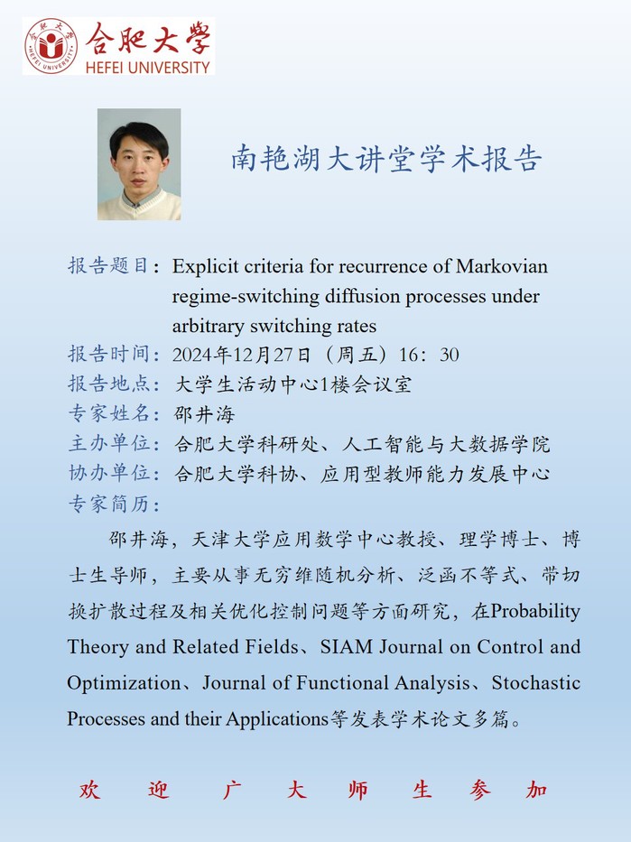 【南艷湖大講堂】Explicit criteria for recurrence of Markovian regime-switching diffusion processes under arbitrary switching rates