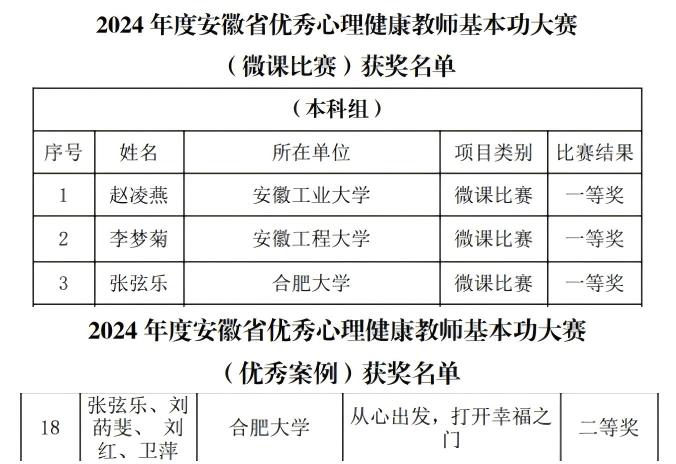 為貫徹黨的二十大和二十屆三中全會精神,落實教育部等十七部門聯合印發《全面加強和改進新時代學生心理健康工作專項行動計劃(2023—2025年)》和安徽省教育廳等十七部門聯合印發《全面加強和改進新時代學生心理健康工作的若干舉措》要求,進一步提高心理健康教育工作水平,促進心理健康教育教師專業發展,教育廳舉辦了優秀心理健康教師基本功大賽。我校組織專業教師積極備賽、參賽,其中教育學院張弦樂在微課教學比賽中榮獲一等獎,教育學院張弦樂、劉菂斐、劉紅、衛萍在優秀案例比賽中榮獲二等獎。