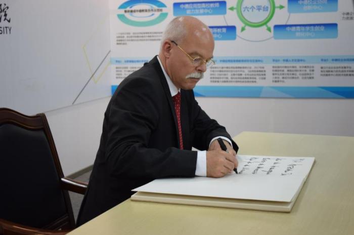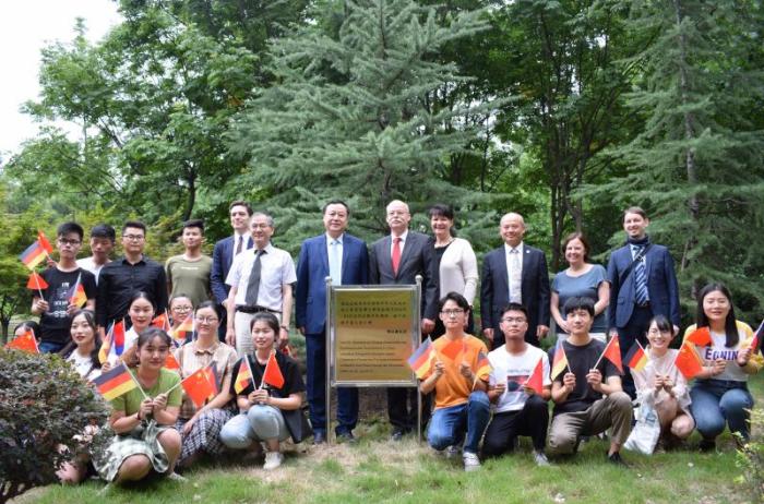 7月8日下午,德國駐華大使葛策博士一行訪問合肥學院。校黨委書記蔡敬民,黨委副書記、校長王其東在中德友誼林熱情會見來賓。德語專業的學生們手持中德兩國國旗夾道歡迎,葛策博士等人與學生進行親切交談。