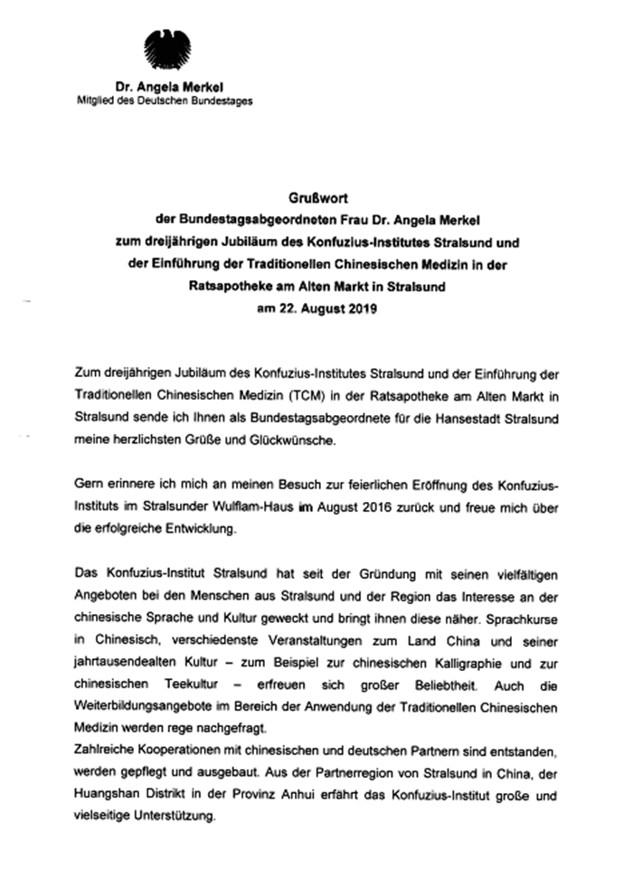 日前,德國施特拉爾松德孔子學院舉行成立三周年慶典暨施特拉爾松德拉茨藥房中藥配方顆粒部門成立儀式,德國總理默克爾致信祝賀。施特拉爾松德市市長亞歷山大·巴德羅在儀式上宣讀了默克爾賀信。