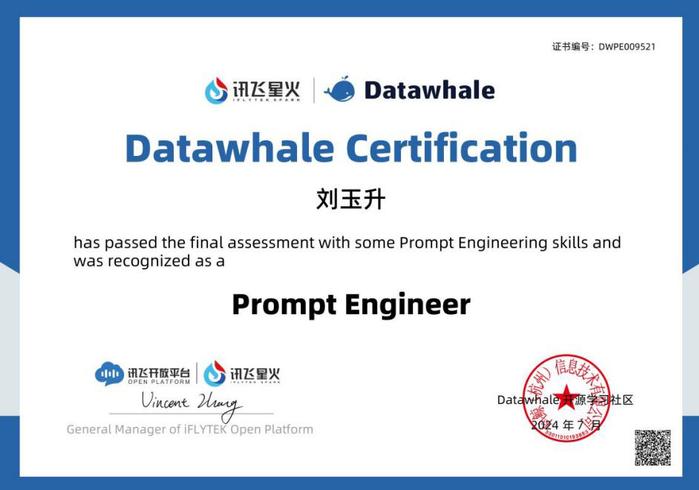 2024年6月至9月,在導師推薦下,劉玉升通過選拔進入科大訊飛股份有限公司訊飛數(shù)碼研究院實習,深度參與了訊飛星火大模型的研發(fā)工作,主要負責Prompt工程優(yōu)化任務。憑借扎實的專業(yè)基礎和出色的工程能力,他系統(tǒng)性地完成了各類任務的整編工作,通過深入分析客戶需求,制定了差異化的Prompt優(yōu)化策略。在數(shù)據(jù)處理層面,他運用Python對訓練數(shù)據(jù)進行清洗與統(tǒng)計分析,成功構建了包含10萬余條的高質量SFT數(shù)據(jù),覆蓋33個具體任務場景。此外,他還參與了大模型效果的評測工作,為后續(xù)模型的迭代優(yōu)化提供了支持。