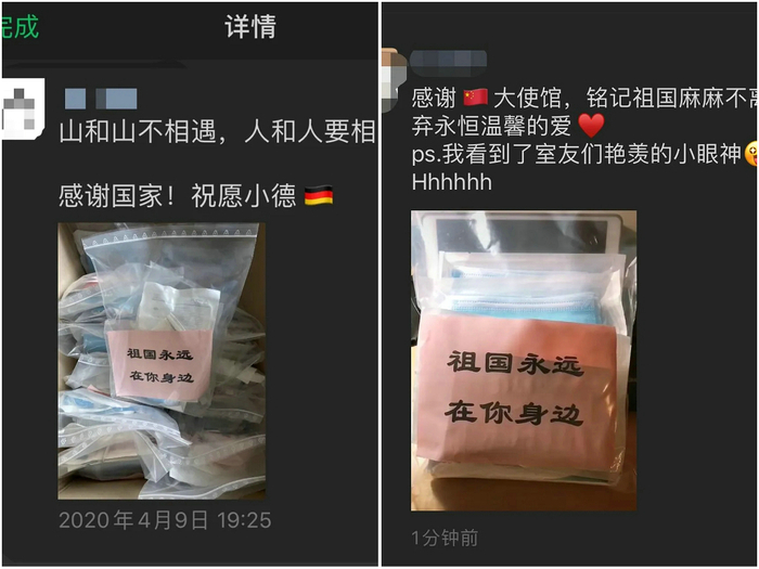 In jedem Anti-Coronas-Paket sind zwei Mundschutzmasken N95, zwanzig chirurgische Schutzmasken, Desinfektionstücher und eine Broschüre zur Aufkl?rung hinsichtlich des Grundwissen über Corona enthalten. Der Wert des Pakets l?sst sich gerade in diesem Moment, wo Deutschland stark unter dem Mangel an medizinischen Gütern und Materialien gegen Corona leidet, nicht einfach sch?tzen. Studierende posteten online und im Freundeskreis Fotos zum Ausdruck ihrer Dankbarkeit an China, des chinesischen Konsulat und Unternehmen in Deutschland sowie Mitarbeiter der Studentenvereinigungen für ihre Arbeit. Sie wünschen sich Wohlstand und Prosperit?t für China und baldige Genesung von dieser Krise.