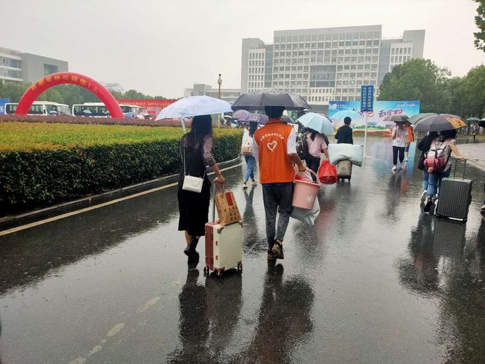 在學校各個門口、咨詢服務點、各學院報到處、新生宿舍,隨處可以看到我校迎新志愿者們忙碌的身影,他們為新生提供校園引導、報到咨詢、行李運送、臨時休息等新生服務。他們身上的志愿者服裝、志愿者證件,如一面面高高飄揚的旗幟,指引著新生同學們。在各車站,志愿者們在出站口迎接著師弟師妹們;在校園路口,志愿者們撐著傘為新生指路,帶領他們去迎新點辦理報到手續;在迎新點,志愿者們幫助新生完成報到流程,幫助他們搬運行李,為他們提供便利。
