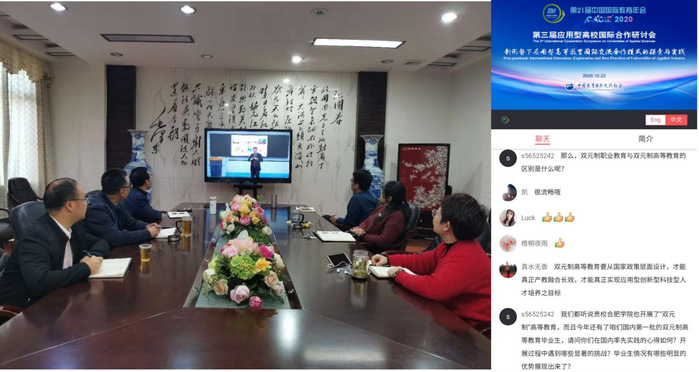 本次研討會邀請了8位國內外應用型高校及機構的校領導、專家學者分別圍繞會議主題作了主旨報告,共同研討應用型高校如何應對全球疫情對教育國際合作產生的深遠影響,探討后疫情時代應用型人才培養的新思路與新模式,為推動國際化應用型人才培養質量提升提供有益借鑒。與會發言人與線上參會人員進行了討論與互動。中外專家與參會人員突破了障礙相聚云端,共同探討應用型高校建設和發展。