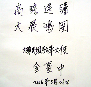 院領導劉立成、蔡敬民、鄭永紅、陳嘯、丁明等首先在主教學樓2樓會議室親切會見金夏中一行。會見中,副院長蔡敬民教授向金夏中介紹了我院的辦學情況特別是我院的中韓合作辦學情況,指出趙誠惠老師為我院對韓合作辦學作出的積極貢獻。金大使的到來必將推動我院與韓國高校辦學的進一步發展,也必將對提升我院在中韓合作院校的重要地位產生巨大影響。金夏中大使在會談時說,合肥學院是安徽省對外發展的一個重要窗口,我很榮幸來貴校訪問并做演講。此次訪問安徽的目的是進一步了解安徽,探討雙方合作與發展的前景與措施。其次是看望老朋友趙誠惠夫婦,感謝她們為韓中友誼所做出貢獻。簡短的會談結束后,金夏中大使為我院題詞:“高瞻遠矚,大展宏圖”。