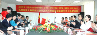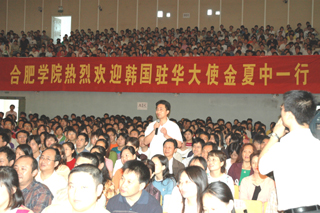 接著,金夏中大使來到禮堂,為我院近1500名師生作“攜手共創中韓關系美好未來”演講。金夏中大使在演講前幽默詼諧地解讀自己的名字說:“夏即華夏的夏,中即中國的中,說明我與中國很有緣分。”2002年,金夏中大使曾經訪問過安徽,通過這次訪問,他覺得安徽的變化很大。他說,非常珍惜這次訪問機會,安徽出了很多名人,韓國與安徽的交流處于起步階段,想多走走看看,多了解安徽,安徽為中國的改革開放作出過很多貢獻,也反映了安徽人民的精神。他在演講中從韓國的經濟發展,韓劇《大長今》、《我的野蠻女友》等曾在中國流行的韓國電視劇談到韓國的飲食和電子、汽車工業;從中國的滾滾“韓流”和韓國的陣陣“漢風”談到韓中文化的交互融合;從他個人學習漢語和出任駐中國大使談到他與中國的不解之緣;從韓中的發展歷史談到中國國家主席胡錦濤訪問韓國時與韓國總統盧武鉉達成的共識“在政治上,中韓兩國應該成為不同社會制度國家和平共處的典范。”