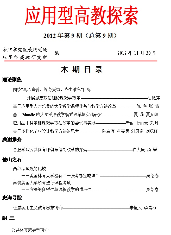 《應用型高教探索》第 9 期以“公共課教學改革和課程考核方式改革”為主題組稿,目錄如下,具體內(nèi)容請查閱發(fā)展規(guī)劃處網(wǎng)站,并將您的寶貴意見或建議反饋至我處。