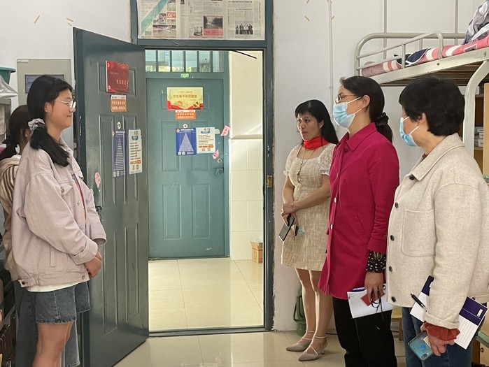 走訪過程中,陳秀叮囑同學(xué)們要緊繃疫情防控之弦,積極配合學(xué)校疫情防控工作;優(yōu)化時(shí)間安排,靜下心、多思考,高質(zhì)量完成線上學(xué)習(xí)任務(wù);注意宿舍衛(wèi)生,勤通風(fēng)、多消毒;加強(qiáng)體育鍛煉,提高身體素質(zhì)。隨后,她與學(xué)生們親切交談,詳細(xì)了解了學(xué)生們在封校期間所遇到的困難以及她們在線上學(xué)習(xí)、公寓住宿、寢室衛(wèi)生、食堂供應(yīng)、文體活動(dòng)等方面的建議。陳秀表示,困難都將被解決,疫情終將會過去,希望同學(xué)們積極適應(yīng)新情況,繼續(xù)堅(jiān)持每日健康打卡,做好個(gè)人防護(hù),及時(shí)上報(bào)異常情況。