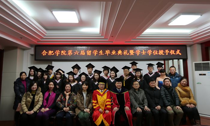 我校學位評定委員會委員、學位辦主任、副校長陳嘯宣讀合肥學院學位評定委員會“關于授予李栽星等十八位留學生學士學位的決定”,其中16人獲得文學學士學位、2人獲得工學學士學位。蔡敬民、陳嘯分別為18位留學生頒發畢業證書、學位證書和撥流蘇、合影。