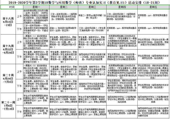 受教育研習(xí)成功經(jīng)驗(yàn)的鼓舞,數(shù)學(xué)與統(tǒng)計(jì)系再接再厲,在教務(wù)處和人工智能與大數(shù)據(jù)學(xué)院領(lǐng)導(dǎo)的關(guān)心和支持下,在數(shù)學(xué)與統(tǒng)計(jì)系王磊主任的帶領(lǐng)下,秉承“學(xué)生中心、產(chǎn)出導(dǎo)向”的原則,經(jīng)過(guò)反復(fù)調(diào)研,積極籌備,為2018級(jí)數(shù)學(xué)專(zhuān)業(yè)74名師范生量身制定了為其四周的線(xiàn)上教育見(jiàn)習(xí)實(shí)訓(xùn)(6月15日-7月10日)。此次活動(dòng)形式創(chuàng)新、內(nèi)容豐富,包括“線(xiàn)上書(shū)寫(xiě)比賽”“線(xiàn)上演講比賽”“一周一課、課課通關(guān)”“專(zhuān)家課例點(diǎn)評(píng)”“教研見(jiàn)習(xí)反思”“第十一屆安徽省師范生技能大賽十強(qiáng)集訓(xùn)”等系列活動(dòng)。在教育見(jiàn)習(xí)過(guò)程中,邀請(qǐng)了合肥一中劉娟、胡媛媛,合肥六中徐小松,合肥一六八中學(xué)黃小娟、張玉萍等知名中學(xué)的5位一線(xiàn)教師和合肥市教育局的許曉天、張永超等數(shù)學(xué)教研員。他們充分參與了學(xué)生教學(xué)視頻的觀摩與評(píng)改,專(zhuān)業(yè)的線(xiàn)上教學(xué)評(píng)價(jià)講座等活動(dòng),充分踐行了《中學(xué)教育專(zhuān)業(yè)認(rèn)證》中強(qiáng)調(diào)的“高校,地方政府,中學(xué)”三位一體、協(xié)同育人的新形式。