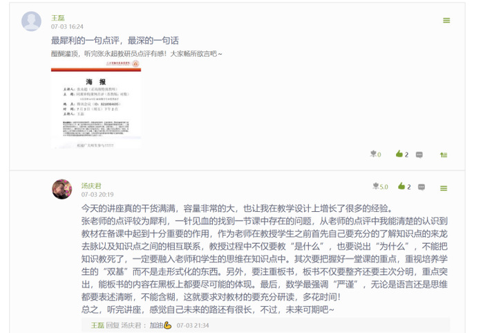 線(xiàn)上見(jiàn)習(xí)效果好不好,還得學(xué)生說(shuō)了算。在7月3日合肥市教育局正高級(jí)特級(jí)教師張永超老師持續(xù)時(shí)長(zhǎng)3個(gè)小時(shí)的關(guān)于“對(duì)數(shù)”的課題點(diǎn)評(píng)講座后,18數(shù)學(xué)趙強(qiáng)同學(xué)在學(xué)習(xí)通平臺(tái)寫(xiě)下了長(zhǎng)達(dá)1600字的感言:“首先真的很感謝有這樣一個(gè)與名師線(xiàn)上對(duì)面的機(jī)會(huì),張永超老師在昨日花費(fèi)了近三小時(shí)的寶貴時(shí)間給我們帶來(lái)的講座,這場(chǎng)探討交流課不得不用精彩去形容,如果再加一個(gè)字,那就是很精彩!聽(tīng)完張老師就對(duì)數(shù)概念這堂課從而深入的數(shù)學(xué)思想、數(shù)學(xué)方法和數(shù)學(xué)精神都頗具特色,他用他獨(dú)特的視角與方式……”。