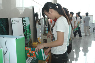 此次作品展主要分為工業設計和藝術設計兩大類,內容廣泛,題材新穎。展出的工業設計作品多為產品造型設計,并配有實物模型,便于參觀者更加直觀形象地了解學生創作的作品。公交站臺建造設計的人性化,家庭櫥具設計的情趣化,無不表現出畢業生設計理念的成熟和構思的精巧。此外,生活工藝品、家用小電器等作品因其實用、美觀、貼近人們的生活也受到了參觀者的好評。在《纖維藝術壁畫――奧運會入場壁畫設計》的作品前,許多老師和同學駐足觀看并對其整體圖案設計、工藝技巧嘖嘖稱贊。展出的藝術設計類作品也不乏精品,一些如“徽典裝飾”、“東菱芝園”之類的廣告招貼設計,作者通過對色彩、造型等方面靈活的運用將商品本身的特色及內涵展現得淋漓盡致。一位參觀者談到對這些作品的感受時說:“我院藝術設計系畢業生能夠將書本上的理論知識應用到實際創作之中,并且設計得如此精良,確實很不錯。”