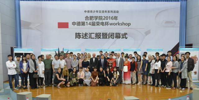 本屆WORKSHOP合作項目逢中德青少年交流年,第二階段的文化交流活動,藝術設計系邀請了安徽省京劇院專業藝術家表演了文藝節目,精彩的水袖、京劇靠旗、川劇變臉表演輪番上演,會場內掌聲此起彼伏,氣氛熱烈。會后,德國老師和同學們紛紛和表演藝術家合影留念,表示領略了博大精深的中國文化,活動很有紀念意義,第十四次WORKSHOP項目雖然結束了,但WORKSHOP項目需要長期進行,我們已經開始期待明年WORKSHOP的到來。