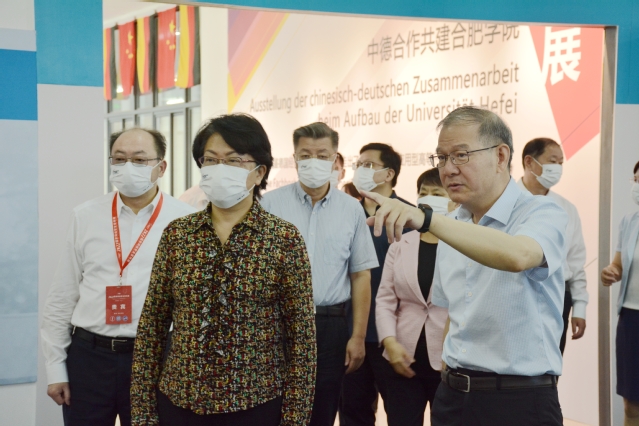 W?hrend des Besuchs der Ausstellung über die chinesisch-deutsche Zusammenarbeit beim Bau der Universit?t Hefei h?rten Weng Tiehui und ihre Delegation Wang Qidongs Einführung in die Geschichte der Gründung der Universit?t Hefei, der Bildungs- und Unterrichtsreform, den internationalen Austausch und die Zusammenarbeit sowie der Integration von Produktion und Bildung an. Weng Tiehui würdigte die Praxis der ?Einrichtung von Studieng?ngen anhand des gesellschaftlichen Bedarfs“ und best?tigte die die Leistungen einer anwendungsorientierten Hochschulbildung auf hohem Niveau.