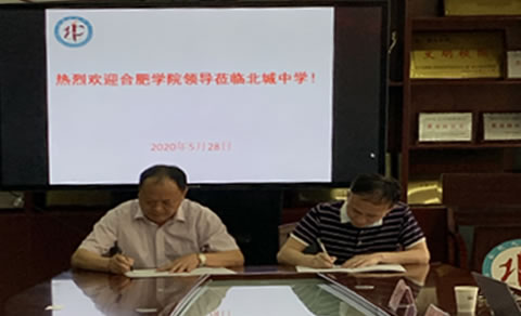 2020年5月28日,合肥學(xué)院—合肥北城中學(xué)(合肥一中北城校區(qū))“優(yōu)質(zhì)生源基地”簽約授牌儀式在合肥北城中學(xué)行政樓會(huì)議室舉行。合肥學(xué)院人工智能與大數(shù)據(jù)學(xué)院院長檀明、數(shù)學(xué)與統(tǒng)計(jì)系主任王磊、副主任牛勇、行政助理劉艷,合肥北城中學(xué)校長王東錄、副校長王克成、校長助理賀東旭、年級(jí)部主任尹連輝,北城中學(xué)各年級(jí)部代表等領(lǐng)導(dǎo)出席會(huì)議。會(huì)議由合肥北城中學(xué)校長王東錄主持。