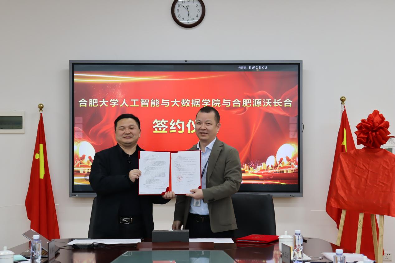 最終,在雙方領導和與會人員的共同見證下,合肥大學人工智能與大數據學院院長余海峰和合肥源沃總經理陶庚申共同簽署了合作協議,并舉行了揭牌儀式。