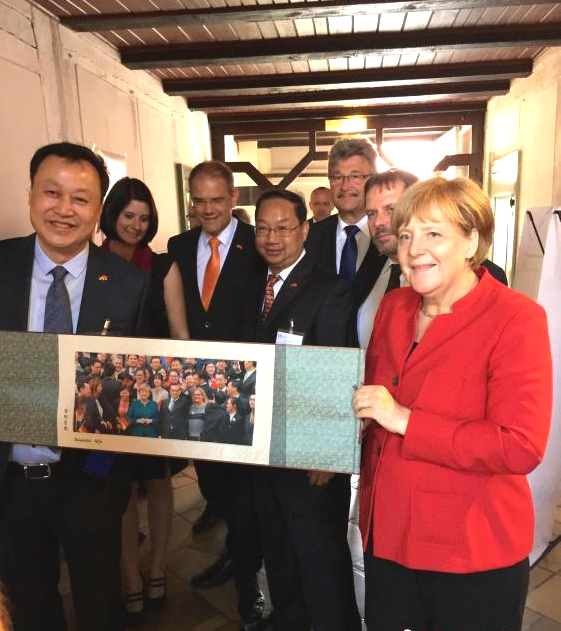 中國駐德國大使史明德、國家漢辦(孔子學(xué)院總部)主任許琳出席儀式。黨委書記蔡敬民代表合肥學(xué)院于現(xiàn)場向默克爾總理展示并贈送了由去年中德兩位總理訪問學(xué)校期間合影制作的紀念品。