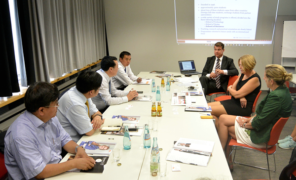 8月29日上午,代表團到訪位于德國威廉港的雅德大學,與該校校長瓦爾森斯教授、外辦主任梅恩女士等就兩校2+3專業共建、學生交流等后續合作事宜進行了討論,并會見了我校于當地學習的近20位留學生代表,詳細了解了他們的學習和生活情況,并鼓勵他們發揚我校留德前輩的刻苦精神,爭取在學業和工作上取得更大突破。代表團一行還于威廉港拜訪了我校德籍合作老專家邁勒斯教授,蔡敬民書記向其介紹了學校對德合作,特別是基地建設的進展情況。29日下午,代表團繼續訪問羅斯托克大學,并與我校德籍客座教授、中國政府友誼獎獲得者萊勒斯教授,以及該校國際辦公室主任帕爾魯斯先生,就兩校開展德語教師交流培訓、德語教學合作、環保與生物質能源領域協同創新平臺建設等事宜進行了意見交流。30日上午,蔡敬民一行來到施特拉爾松德,在籌備我校孔子學院揭牌活動前期,與施特拉爾松德應用科學大學校長、中國政府友誼獎獲得者、我校客座教授霍恩,以及該校副校長皮特森教授,就兩校未來合作的重點領域及孔子學院事宜進行了交流。31日上午,蔡敬民書記率代表團拜訪安哈爾特應用科學大學,該校新任校長巴格丹教授、我校德籍客座教授凱爾斯騰等人給予了接待。蔡敬民首先對巴格丹教授新任校長一職表示了祝賀,并對凱爾斯騰教授生日當天接待我校代表團一行表示感謝和祝賀,并介紹了我校中德基地建設的發展情況。巴格丹校長表示期望于近期訪問合肥學院并期待安哈爾特應用科學大學可以在中德基地建設領域發揮作用。9月6日上午,代表團一行受邀訪問耶拿應用科學大學,該校外辦主任福斯特女士及電子系教授迪特里希給予了接待,并引導參觀了該校先進電子技術實驗室及激光加工實驗室。福斯特女士在了解了我校對德合作及基地建設情況后,詳細介紹了該校針對中國交換學生的專業及服務工作,并期待明年訪問合肥學院時就兩校合作簽署協議。6日下午,代表團前往希爾德斯海姆訪問我校傳統合作高校——希爾德斯海姆/霍爾茨明登/哥廷根應用科學大學,該校校長丁奈爾教授及外辦主任考茲女士對我校一行的訪問表示歡迎,并介紹了該校后期國際化發展戰略,期望結合我校基地建設,進一步深化雙方已有的31年友好合作關系。8日下午,代表團受邀訪問美因茨應用科學大學,該校經濟系主任邁勒-畢歇爾教授、國際項目負責人亨塞爾教授及史蘭克教授,對期待已久的我校到訪表示歡迎,雙方就兩校合作簽訂了框架協議。校方向代表團一行著重介紹了該校極具特色的經濟類雙元制高等教育培養模式,并就下一步合作的重點方式等內容進行了交流和確定。