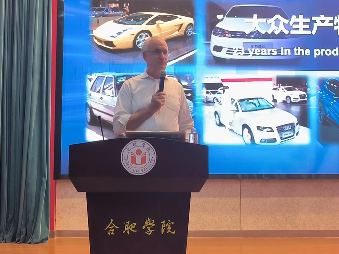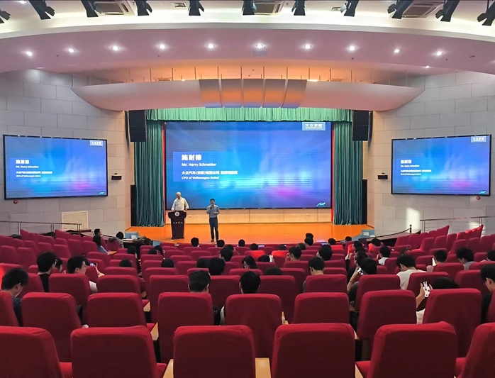 施耐德教授圍繞大眾汽車,對(duì)汽車制造工藝、汽車生產(chǎn)中的智能化趨勢(shì)應(yīng)用案例以及智能制造方案如何落地等內(nèi)容進(jìn)行了詳細(xì)講解。在互動(dòng)交流環(huán)節(jié),同學(xué)們積極提問(wèn),施耐德教授耐心解答,并對(duì)大眾學(xué)院的學(xué)生提出了殷切期望。