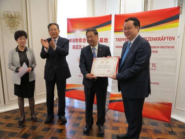 Herr Li Jinbin hob hervor, dass die Ernennung von Herrn Botschafter Shi Mingde zum Ehrenprofessor derUniversit?t Hefei den Aufbau der Modelleinrichtung zur Bildungskooperation beider L?nder, sowie die Anwerbung qualifizierten Personals aus Deutschland in China zukünftig voranbringen wird.