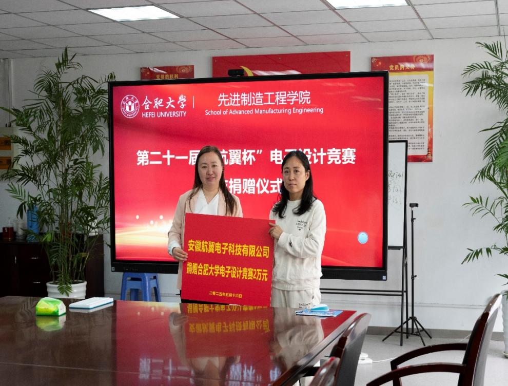 安徽航翼電子科技有限公司總經理張永麗、副總經理張翼、先進制造工程學院黨委書記杜娟、院長胡學友、副院長胡國華、電子設計競賽負責人李翠花等參加捐贈儀式。