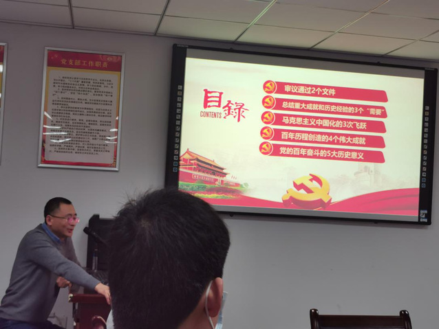 2022年3月25日,學院黨委委員、副院長胡學友為支部黨員做了一場有關黨的十九屆六中全會精神的報告。胡院長從“黨的百年奮斗的10大歷史經驗”、“黨的十八大以來13個方面的重要成就”、“全黨4個必須”、“黨中央的1個號召”、“審議通過2個文件”、“總結重大成就和歷史經驗的3個需要”、“馬克思主義中國化的3次飛躍”、“百年歷程創造的4個偉大成就”以及“黨的百年奮斗的5大歷史意義”共九個方面來進行闡述。
