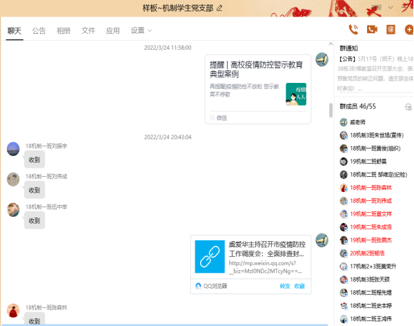 黨旗在肩,戰“疫”必勝。機制學生學生黨支部把黨建工作與抗擊疫情緊密聯系,把聚焦打贏疫情防控阻擊戰作為當前工作的首要任務,組織學習《中共合肥市委組織部關于在疫情防控中充分發揮基層黨組織戰斗堡壘作用和黨員先鋒模范作用的通知》和習近平總書記在中共中央政治局常務委員會會議上關于從嚴抓好疫情防控工作的重要講話精神,推動黨員沖在一線,干在實處,奮勇爭先。
