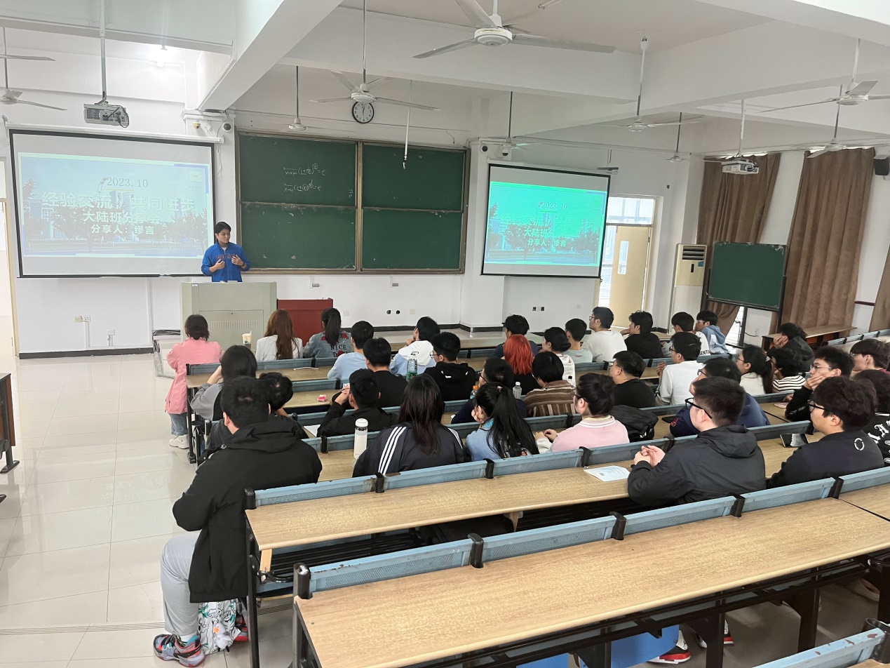 10月11日中午,合肥學(xué)院大陸班優(yōu)秀畢業(yè)生繆言同學(xué)經(jīng)驗(yàn)交流會(huì)在38-3jt教室順利舉行。繆言同學(xué)作為16級(jí)優(yōu)秀畢業(yè)生,為20級(jí)、22級(jí)和23級(jí)大陸班同學(xué)分享了自己在本科,碩士階段學(xué)習(xí)和生活的經(jīng)驗(yàn),以及對(duì)博士階段的展望。