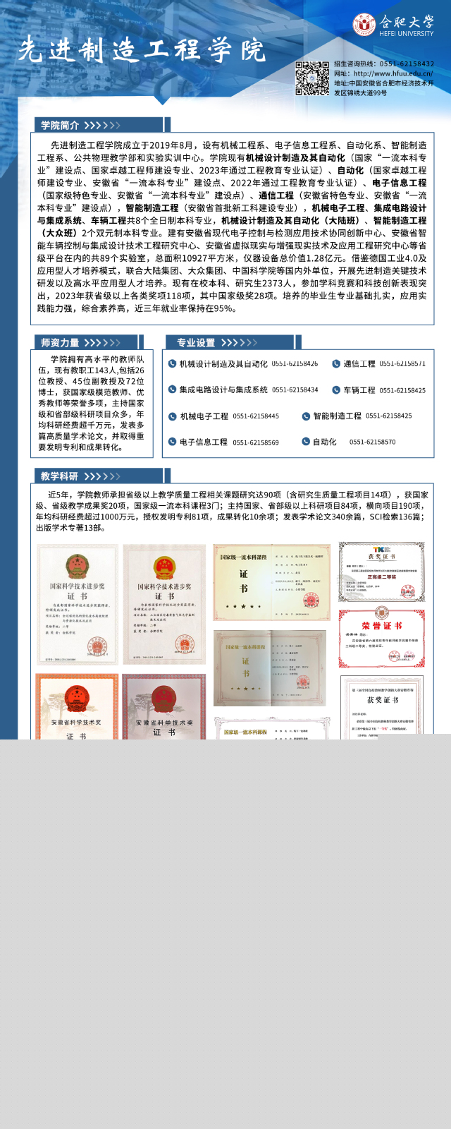 先進制造工程學院成立于2019年8月,設有機械工程系、電子信息工程系、自動化系、智能制造工程系、公共物理教學部和實驗實訓中心。現有教職工143人,教授25人,具有博士學位72人,擁有國家級模范教師、優秀教師和職業教育杰出教師多名。學院現有電子信息、機械兩個專業碩士學位授權點,設有機械設計制造及其自動化(國家首批國家級一流專業建設點)、機械設計制造及其自動化“雙元制”(國家首個新工科雙元制建設專業)、機械電子工程、智能制造工程,車輛工程,電子信息工程(國家級特色專業),自動化(國家卓越工程師教育培養計劃專業),通信工程、集成電路設計與集成系統9個本科專業。建有現代電子控制與檢測應用技術協同創新中心、安徽省智能車輛控制與集成設計技術工程研究中心、虛擬現實與增強現實(AR/VR)應用技術等省級實驗平臺在內的共89個實驗室,總面積超1萬平方米。借鑒德國工業4.0及應用型人才培養模式,聯合大陸集團、德國大眾汽車集團、中國科學院等國內外單位,開展先進制造關鍵技術研發以及高水平應用型人才培養。現有在校本科、研究生2447人,參加學科競賽和科技創新表現突出,2022年獲省級以上各類獎項115項,其中國家級獎32項。培養的畢業生專業基礎扎實,應用實踐能力強,綜合素養高,近三年就業率保持在95%以上。