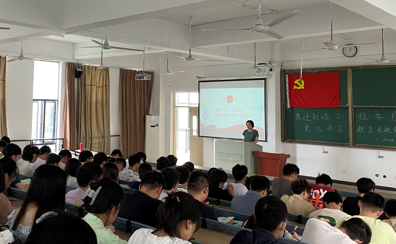 6月4日,為深入學(xué)習(xí)貫徹習(xí)近平總書記關(guān)于加強(qiáng)黨的紀(jì)律建設(shè)重要論述以及關(guān)于黨紀(jì)學(xué)習(xí)教育重要講話和重要指示精神,進(jìn)一步加強(qiáng)畢業(yè)生黨員離校教育,先進(jìn)制造工程學(xué)院黨委副書記、紀(jì)委書記蔡靈美以《做一名合格的中國共產(chǎn)黨員》為題,在38棟3階梯教室為全院畢業(yè)生黨員講述一堂主題鮮明、內(nèi)涵深刻的黨紀(jì)學(xué)習(xí)教育專題黨課。
