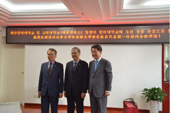 On May 16th, HFU President, Mr. Wang Qidong, meets the delegation from Cheju Halla University (CHU) and Korea University (Sejong Campus, KU-SC), led by Mr. Kim Sung-Hun, President of CHU, and Mr. An Cheung-O, Vice President of KU-SC.