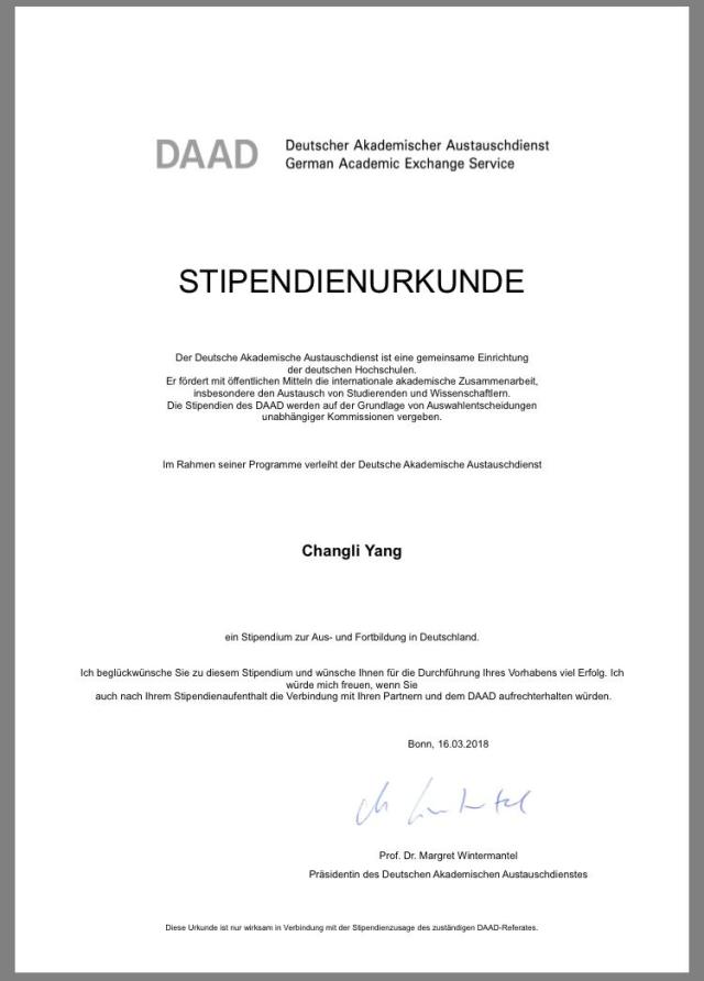 This is the first time that German majors have got a DAAD scholarship, which is designed for those to be engaged in the teaching of German.Yang Changli and Yang Qianwen took the German Language Proficiency Test at Nanjing University in November, 2017 and achieved much better than expected. What’s more,Yang Changli participated in the National Multilingual Interpretation Contest and won the Excellence Award in the same year. They have set a good example for their counterparts in the Department of Foreign Languages.