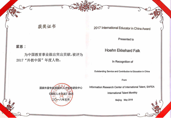 On May 24th, Professor Hoehn Ekkehard Falk, vice president of Hefei University and the winner of "2014 Friendship Award" (China’s highest honor granted to foreigners), is granted the 2017 International Educator in China Awardby the State Administration of Foreign Expert Affairs (SAFEA).