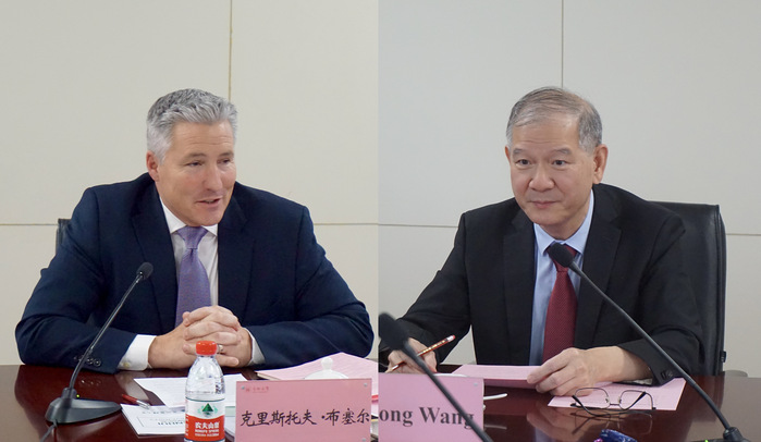 9月25日,我校舉辦安徽省高校與英國(guó)德比大學(xué)合作推進(jìn)會(huì)。德比大學(xué)副校長(zhǎng)克里斯托夫·大衛(wèi)·布塞爾(Christopher David Bussell)率領(lǐng)德比大學(xué)代表團(tuán)出席推進(jìn)會(huì)并訪問(wèn)我校。省教育廳外事處處長(zhǎng)姚德勇、安徽工程大學(xué)黨委書記張志宏、安徽醫(yī)科大學(xué)與安徽師范大學(xué)國(guó)際交流合作負(fù)責(zé)同志參會(huì)。黨委書記王其東對(duì)代表團(tuán)一行來(lái)訪表示熱烈歡迎,黨委委員、宣傳統(tǒng)戰(zhàn)部部長(zhǎng)賈峰主持會(huì)議。