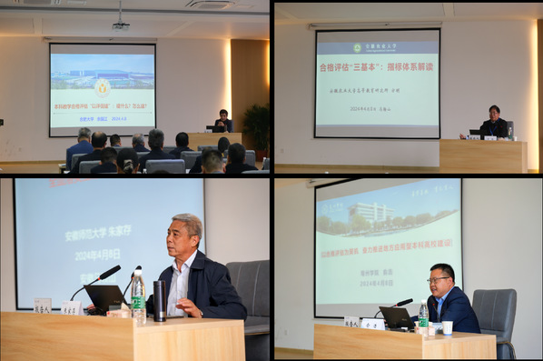 合肥大學(xué)余國(guó)江教授,安徽農(nóng)業(yè)大學(xué)方明教授,安徽師范大學(xué)原副校長(zhǎng)朱家存教授,亳州學(xué)院黨委委員、副院長(zhǎng)俞浩教授,分別從《合格評(píng)估“以評(píng)促建”,建什么?怎么建?》、《合格評(píng)估“三基本”指標(biāo)體系解讀》、《積極構(gòu)建大學(xué)質(zhì)量文化,全面落實(shí)立德樹(shù)人根本任務(wù)》、《以合格評(píng)估為契機(jī)奮力推進(jìn)地方應(yīng)用型本科高校建設(shè)》等方面對(duì)學(xué)校如何推進(jìn)合格評(píng)估工作進(jìn)行了深入解讀,提出了工作建議,分享了合格評(píng)估工作中的經(jīng)驗(yàn)和做法。最后,各高校參會(huì)人員與合格評(píng)估專(zhuān)家進(jìn)行了深入交流討論。