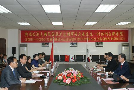 蔡敬民院長首先對(duì)大韓民國駐滬總領(lǐng)事安總基一行的來訪表示熱烈歡迎。隨后,蔡敬民院長對(duì)我院國際化辦學(xué)情況作了介紹。蔡院長說,我院是一所國際化辦學(xué)歷史悠久、辦學(xué)水平較高的本科院校,在亞洲,韓國高校是我院重點(diǎn)合作對(duì)象,同韓國合作歷史悠久,規(guī)模大。我院韓籍教授趙誠惠女士,是第一位獲得我國國家友誼獎(jiǎng)的韓國人,我院韓籍教授、趙誠惠女士的丈夫樸南圭先生也獲得了安徽省最高友誼獎(jiǎng)黃山友誼獎(jiǎng)。目前,我院同韓國合作院校達(dá)13所,我院有700多名學(xué)生在韓國學(xué)習(xí),有20多位老師在韓國獲得博士、碩士學(xué)位。安徽中韓交流平臺(tái)“中國安徽——韓國中心”建在合肥學(xué)院,該中心促使了一大批安徽學(xué)校、企業(yè)同韓國交流合作。韓國在合肥學(xué)院留學(xué)人數(shù)也是逐年增加。今天,安總基先生的到來,是開啟了合肥學(xué)院同韓國高校合作交流的新華章。