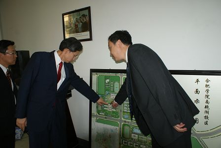 雙方合影留念(左五:安總基領(lǐng)事) 參觀金夏中大使親手種植的友誼樹 觀看我院校園建設(shè)規(guī)劃效果圖 學(xué)生代表提問,安總基領(lǐng)事一行給予了詳細(xì)回答