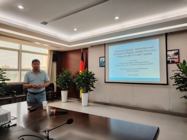 方濤教授以“Attraction and retention of highly skilled overseas Chinese in the United States and Canada”為題給經濟與管理學院師生做一場精彩的學術報告,他結合豐富的研究數據與案例,深入剖析美加兩國吸引和留住海外華人高技能人才的策略。報告結束后,方濤與經濟與管理學院師生、德籍教授湯衛思進行座談,就國際人才流動趨勢、區域經濟發展與人才政策等議題展開討論,碰撞出諸多思想火花。