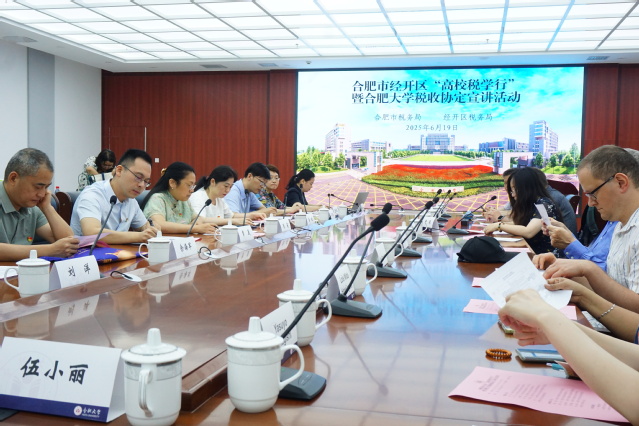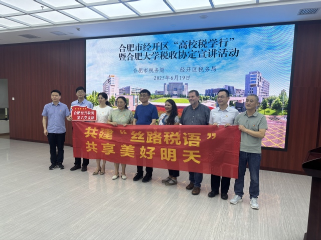 6 月 19 日上午,國際交流合作處、財(cái)務(wù)處聯(lián)合合肥經(jīng)開區(qū)稅務(wù)局在大學(xué)生活動中心一樓會議室舉辦“高校稅學(xué)行”暨涉外稅收協(xié)定宣講活動。合肥市稅務(wù)局國際處、經(jīng)開區(qū)稅務(wù)局相關(guān)負(fù)責(zé)人及稅務(wù)干部,國際交流合作處副處長孔春華、財(cái)務(wù)處副處長唐艷等部門負(fù)責(zé)人,外籍教師、留學(xué)生代表及對國際稅收政策感興趣的師生參與活動。