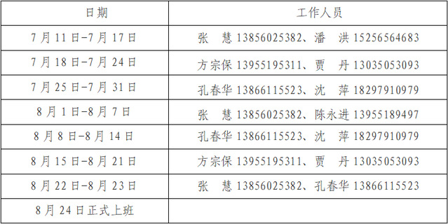 四、暑期實行輪休工作制,請大家根據工作分工和學校重點工作合理安排時間,對于異常情況及時上報,具體排班表如下: