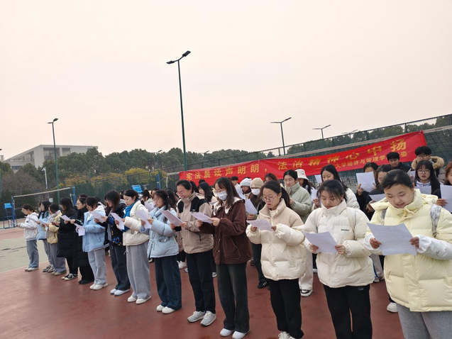 12月13日清晨,參加活動的學生以飽滿的精神狀態在一期校園體育場集合。活動伊始,全體學生排好隊形,整齊肅立。隨后,在領讀同學的帶領下,一起朗讀《憲法》的節選內容。天氣雖然寒冷,但我院學子神情專注而又莊重,朗讀聲清晰而又堅定。在每一聲鏗鏘有力的聲音中,學生們用昂揚向上的熱情驅散了寒意,用奮進拼搏的姿態推動了憲法晨讀活動走向高潮。