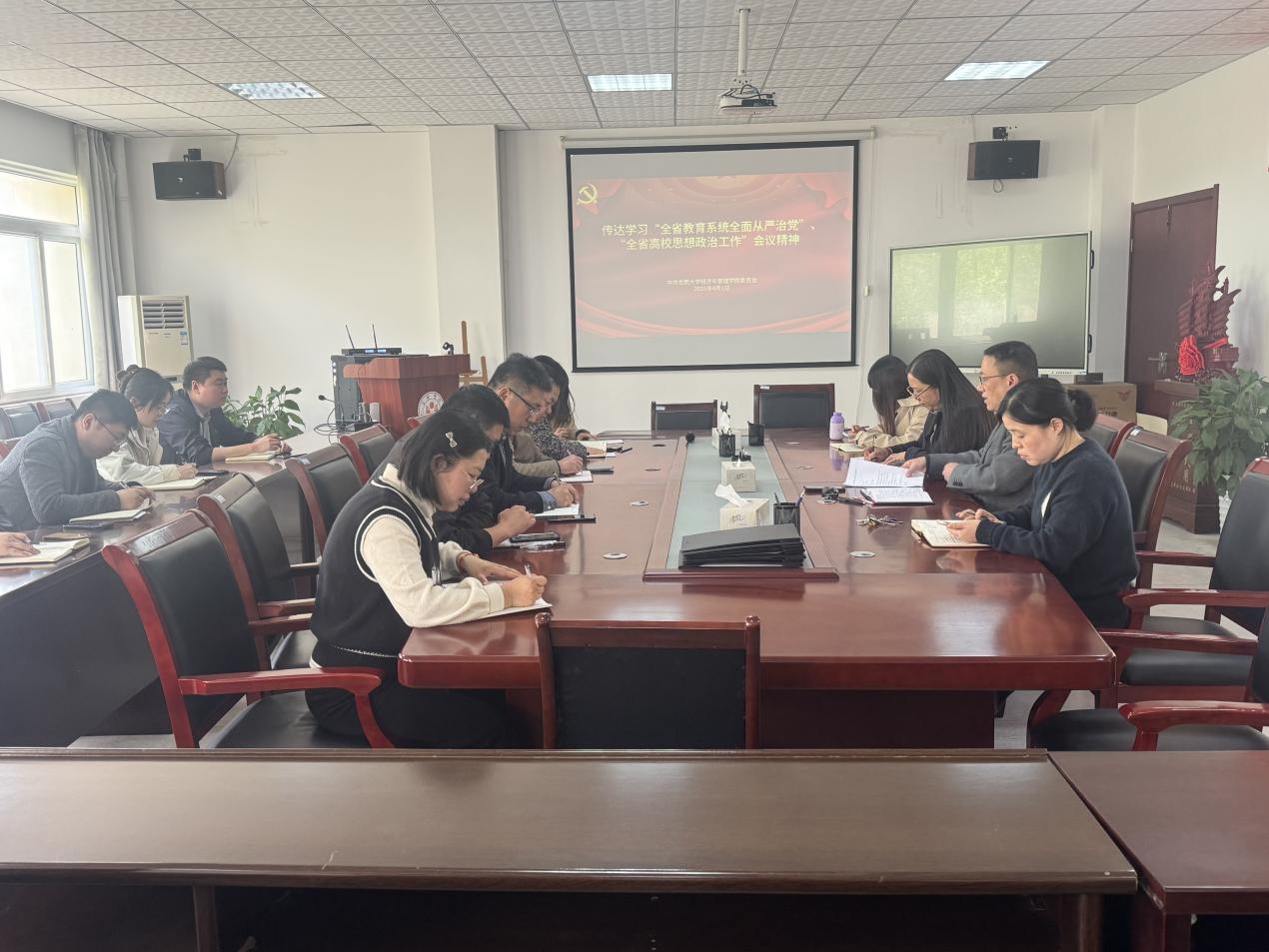 4月1日,經濟與管理學院在一期4棟二樓會議室傳達學習了“2025年全省教育系統全面從嚴治黨工作視頻會議”和“全省高校思想政治工作會議”精神。本次會議由經管學院黨委書記倪澤強主持,系主任和學院科級及以上干部共14人參加會議。