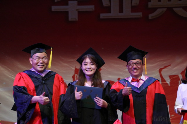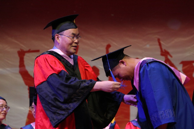 發(fā)言結(jié)束后,學(xué)院黨委書記倪澤強、院長陳江華上臺,為2023屆畢業(yè)生頒發(fā)證書,撥流蘇,并合影留念。