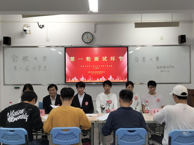 2024年4月28日下午六點,經濟與管理學院于一期六棟進行合肥大學第一屆自薦大賽決賽。學院就業指導老師程越岳余宏強及學生會干部擔任本次大賽的評審。