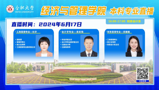 2024年6月17日,合肥大學經濟與管理學院各專業負責人走進直播間,通過在線直播的形式,連接學生與高校,讓未來的大學生們在屏幕前就能夠深入了解我院的本科專業設置、課程內容、師資力量、就業前景及校園生活等方方面面的信息。
