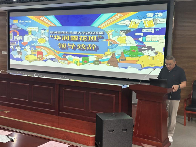 華潤雪花啤酒(安徽)有限公司的領導代表高芳樓也在儀式上發表講話。高芳樓總監代表公司對“華潤雪花班”的成立表示熱烈祝賀,并對學校、學院在人才培養方面給予的支持表示感謝。高芳樓總監介紹了華潤雪花啤酒有限公司目前的發展狀況和未來規劃,特別強調了企業對人才的需求和對“華潤雪花班”學員的期望。他表示,公司將為學員們提供豐富的實踐機會和完善的培訓體系,希望學員們能夠在華潤雪花大家庭中不斷成長,最終成為公司的中堅力量。