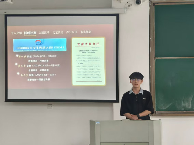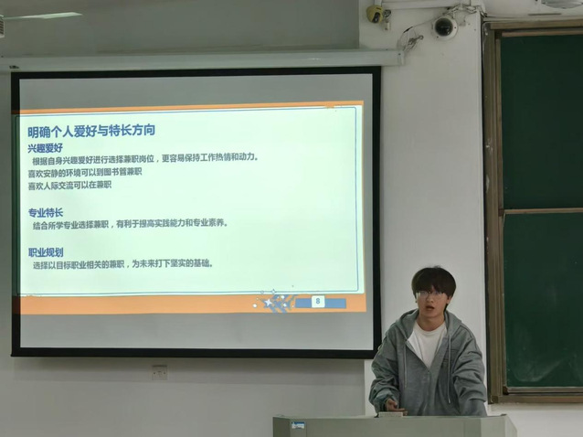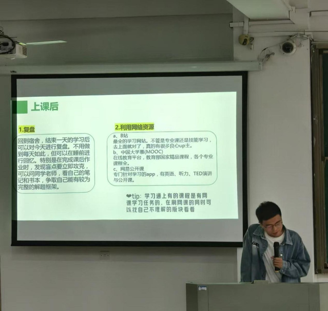 首先,由22級潘炳志學長發言。為了幫助新生有更高的生活質量,他分享在校大學生參加校內外實踐鍛煉的經驗。他指出大學生活是一段充滿挑戰與機遇的旅程,它不僅僅是學習專業知識的地方,更是我們成長、鍛煉和塑造自我的重要階段。