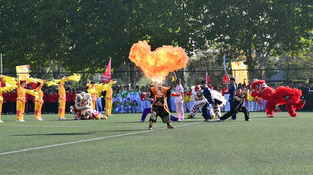 莊嚴(yán)的國(guó)歌聲響起,全體師生肅然起立。隨后,學(xué)校領(lǐng)導(dǎo)發(fā)表了熱情洋溢、振奮人心的開幕致辭,深刻強(qiáng)調(diào)了運(yùn)動(dòng)會(huì)對(duì)于學(xué)校和同學(xué)們的重要意義,鼓勵(lì)同學(xué)們?cè)诒荣愔写罅Πl(fā)揚(yáng)拼搏精神,賽出獨(dú)特風(fēng)格,賽出卓越水平。運(yùn)動(dòng)員代表和裁判代表也分別莊嚴(yán)宣誓,表達(dá)了他們對(duì)比賽的高度尊重和對(duì)公平競(jìng)爭(zhēng)的堅(jiān)定承諾。隨著那精彩絕倫的舞龍舞獅表演在激昂的鼓點(diǎn)聲中落下帷幕,歌曲的余音漸漸消散在空氣中,舞蹈的最后一個(gè)動(dòng)作定格成美麗的畫面,運(yùn)動(dòng)會(huì)開幕式的表演正式宣告結(jié)束。