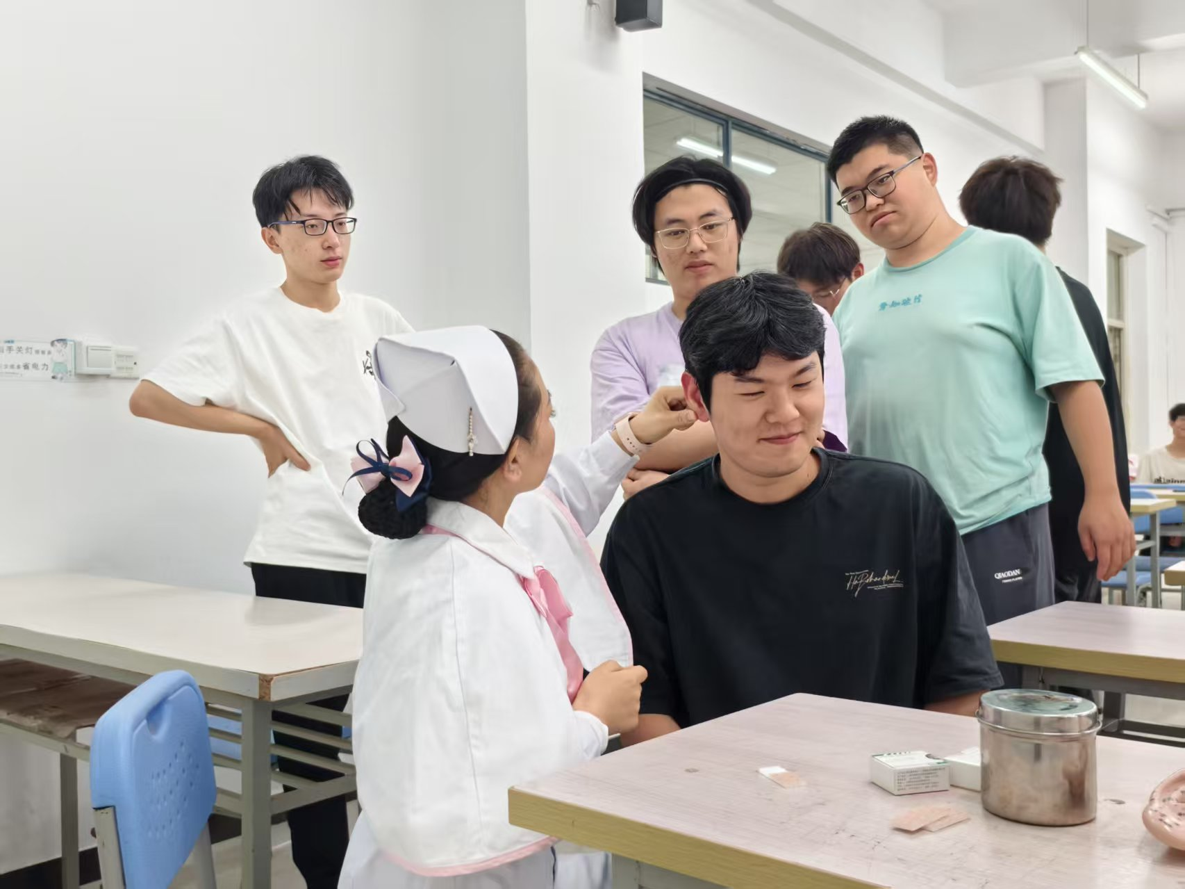 在講解結束后,武老師還為在場的同學們進行了刮痧和耳穴貼壓的實際操作演示。她一邊操作,一邊詳細講解每個步驟的注意事項和技巧,確保同學們能夠掌握這些方法。通過親身體驗,同學們不僅加深了對中醫護理治療的理解,也感受到了其在情緒管理中的顯著效果。