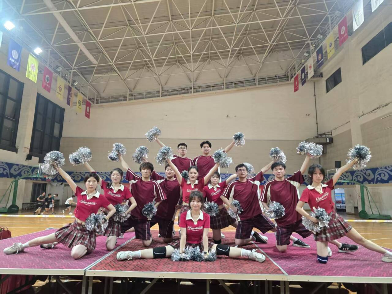 比賽當日,體育館內氣氛熱烈,座無虛席。各院系代表隊紛紛登場,展現出青春的活力與團隊的風采。當材化學院的火舞啦啦隊身著輕快活潑的格子裙隊服閃亮登場時,瞬間吸引了全場的目光。隨著歡快的音樂響起,隊員們以靈動的步伐、俏皮的拍手動作和流暢的旋轉,配合著不斷變換的隊形,將青春的朝氣與熱情盡情釋放,活力灑滿整個賽場。